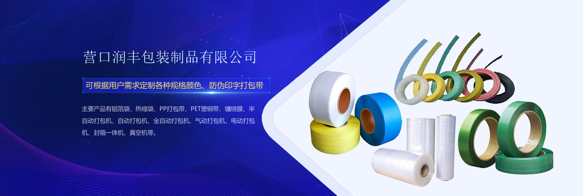 營口潤豐包裝制品有限公司是一家集研發(fā)生產(chǎn)銷售于一體的企業(yè),主要產(chǎn)品有鋁箔袋、熱縮袋、PP打包帶、PET塑鋼帶、纏繞膜、半自動打包機、自動打包機、全自動打包機、氣動打包機、電動打包機、封箱一體機、真空機,并可根據(jù)用戶需求定制各種規(guī)格顏色、防偽印字打包帶。我公司本著客戶至上誠實守信的原則,以精良的產(chǎn)品質(zhì)量,優(yōu)質(zhì)的售后服務(wù),美觀的造型,合理的價格暢銷全國各地并贏得廣大用戶的信賴與好評。